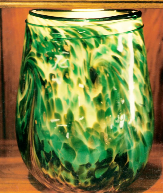 The Native American Basket Series are reproduction in glass of the baskets made by Native Chief Petosegay settled the Petoskey area. This basket represents the style used by them. With a white interior and Mixed greens swirled with adventurine, finished with a Grass Green Multi Lip. 11″ high by 9″ wide.