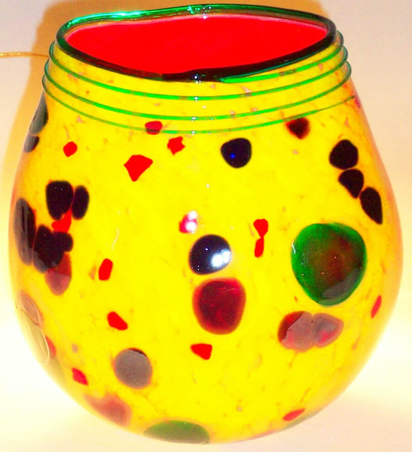 This is one of our series vases. In a rich Kaiser red interior and a bright yellow exterior with spots of grass green, kaiser, burgundy, ruby, and cobalt. Finished with a Grass Green multi lip. 11″ high by 10″ wide